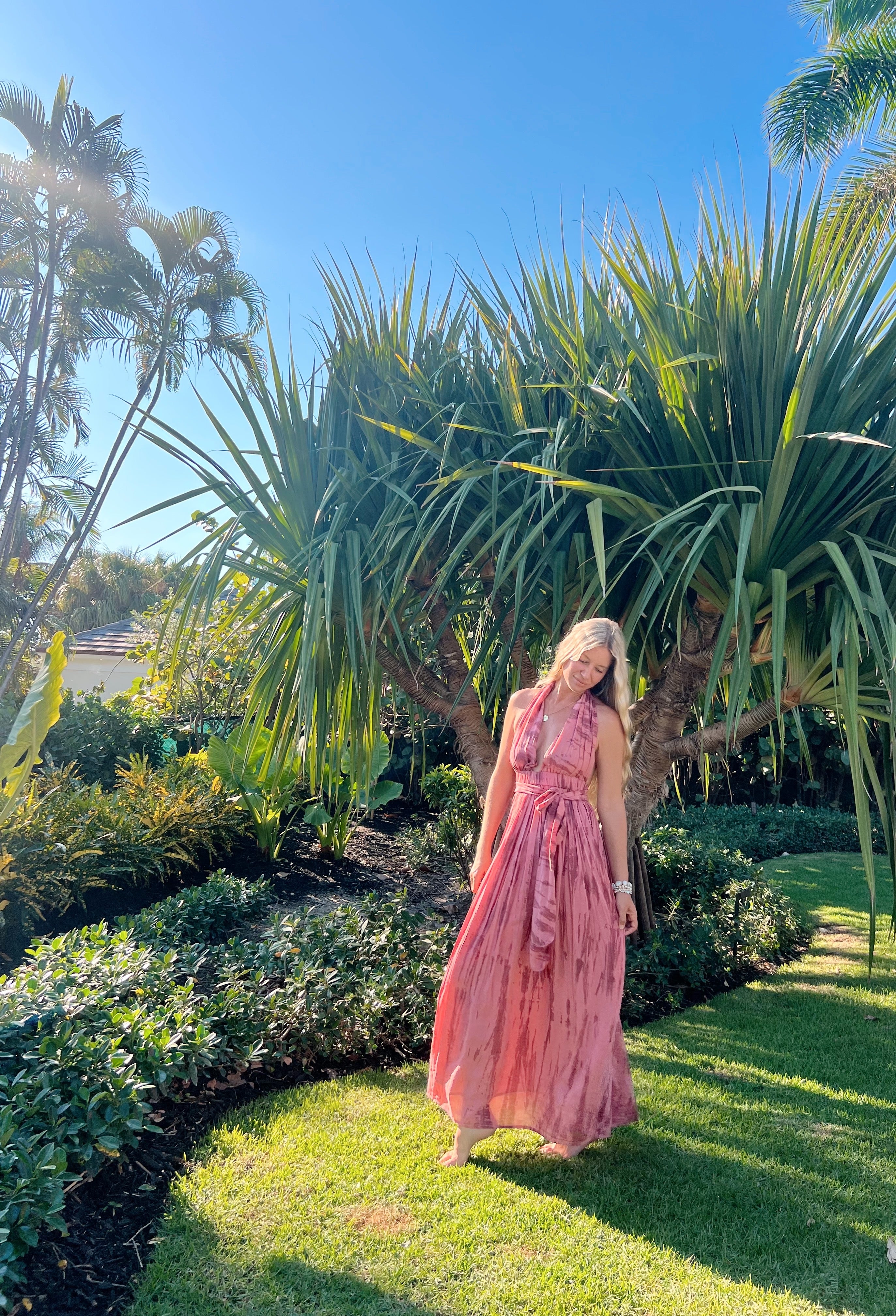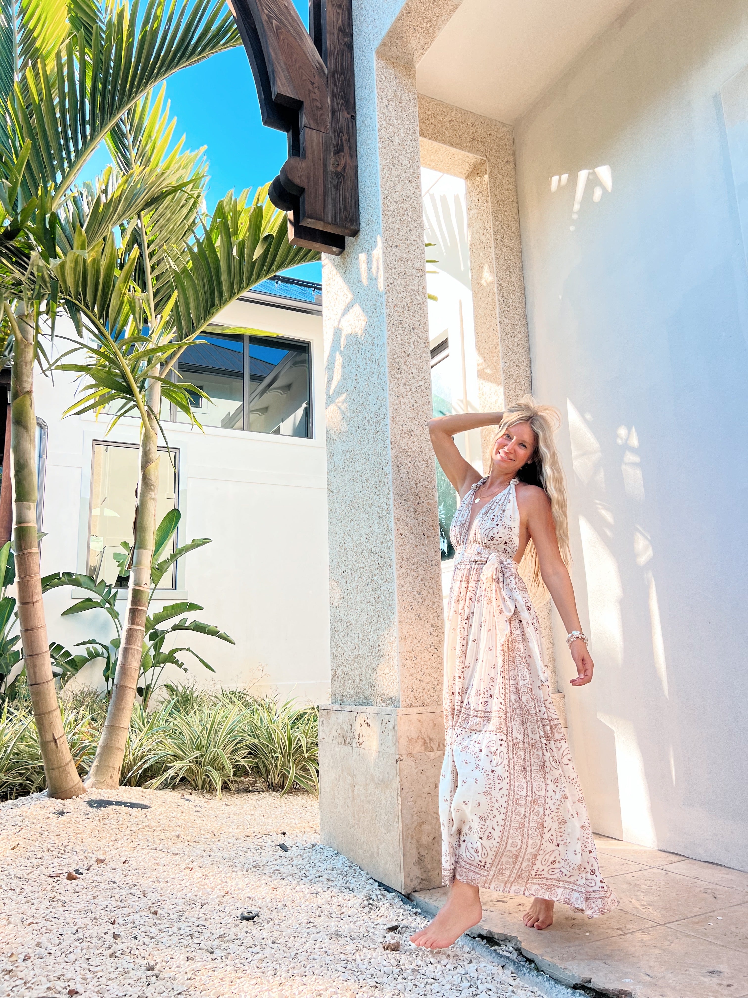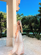 A flowy halter-style maxi dress designed with a soft, bohemian print and an effortlessly elegant silhouette. Its adjustable neckline and lightweight drape make it perfect for warm days, sunset strolls, and dreamy seaside escapes. A timeless blend of comfort, romance, and coastal charm.